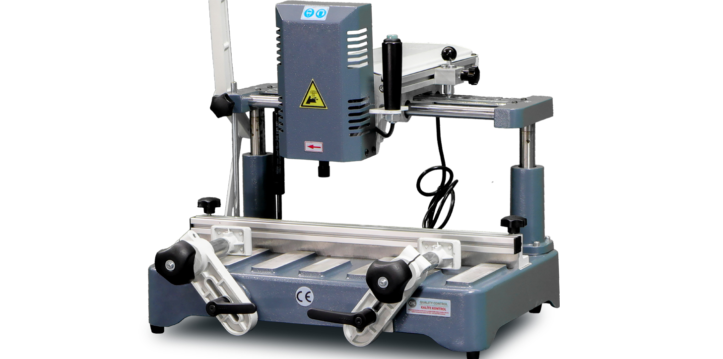 OST-50P designed for various milling and drilling operations such as Espagnolette pockets, water drainage channels, locks, handle locations, hinges, and channel openings in uPVC and aluminum frames, door wings, window wings, and sliding profiles.